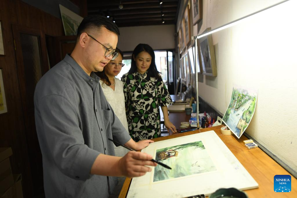 Artist Zhang Tiantian works on a watercolor painting depicting a scene along the Grand Canal at a studio in Xiaohezhi Street historical and cultural block along the Grand Canal in Hangzhou, east China's Zhejiang Province, June 12, 2024. (Xinhua/Weng Xinyang)
