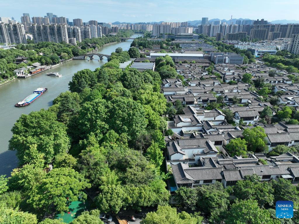 An aerial drone photo taken on June 12, 2024 shows a view of Qiaoxi historical and cultural block along the Grand Canal in Hangzhou, east China's Zhejiang Province. (Xinhua/Weng Xinyang)