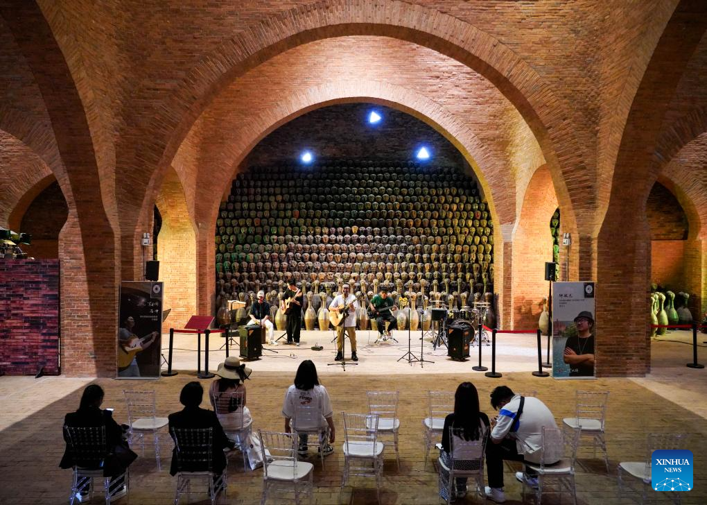 Visitors watch a performance in a museum of Dongfengyun town in Mile, southwest China's Yunnan Province, on June 13, 2024. Located in Mile City, Honghe Hani and Yi Autonomous Prefecture of southwest China's Yunnan Province, Dongfengyun town is a popular tourist attraction built with a main theme of culture and art. The unique architecture, rich art activities and beautiful natural landscape attract tourists from home and abroad. (Xinhua/Wang Jingyi)