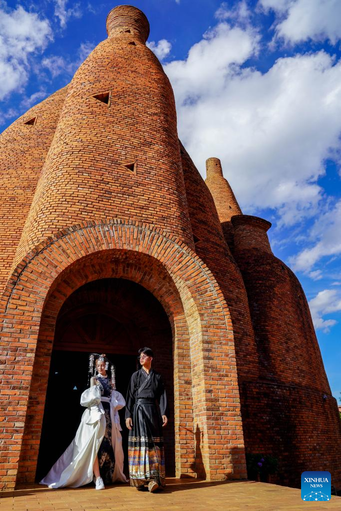 Tourists dressed in distinctive costumes take photos at Dongfengyun town in Mile, southwest China's Yunnan Province, on June 13, 2024. Located in Mile City, Honghe Hani and Yi Autonomous Prefecture of southwest China's Yunnan Province, Dongfengyun town is a popular tourist attraction built with a main theme of culture and art. The unique architecture, rich art activities and beautiful natural landscape attract tourists from home and abroad. (Xinhua/Wang Jingyi)