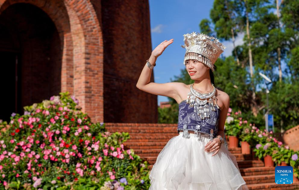 A tourist poses for photos at Dongfengyun town in Mile, southwest China's Yunnan Province, on June 13, 2024. Located in Mile City, Honghe Hani and Yi Autonomous Prefecture of southwest China's Yunnan Province, Dongfengyun town is a popular tourist attraction built with a main theme of culture and art. The unique architecture, rich art activities and beautiful natural landscape attract tourists from home and abroad. (Xinhua/Wang Jingyi)