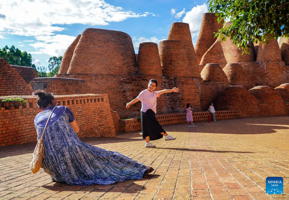 Tourists take photos at Dongfengyun town in Mile, southwest China's Yunnan Province, on June 13, 2024. Located in Mile City, Honghe Hani and Yi Autonomous Prefecture of southwest China's Yunnan Province, Dongfengyun town is a popular tourist attraction built with a main theme of culture and art. The unique architecture, rich art activities and beautiful natural landscape attract tourists from home and abroad. (Xinhua/Wang Jingyi)