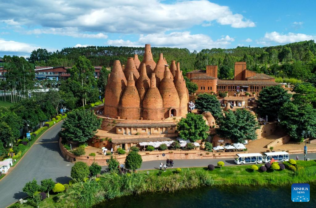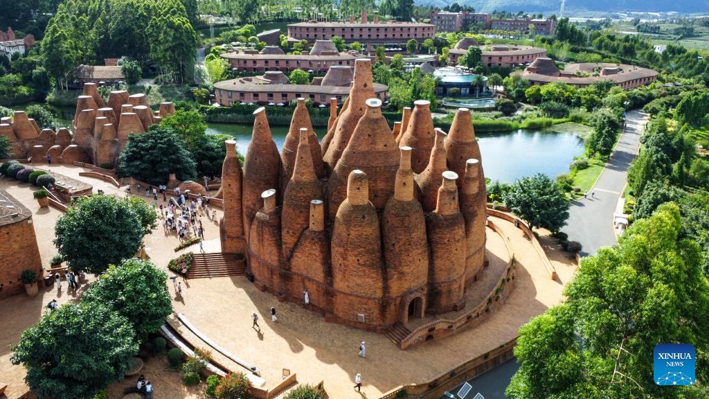 An aerial drone photo taken on June 13, 2024 shows a view of Dongfengyun town in Mile, southwest China's Yunnan Province. Located in Mile City, Honghe Hani and Yi Autonomous Prefecture of southwest China's Yunnan Province, Dongfengyun town is a popular tourist attraction built with a main theme of culture and art. The unique architecture, rich art activities and beautiful natural landscape attract tourists from home and abroad. (Xinhua/Wang Jingyi)