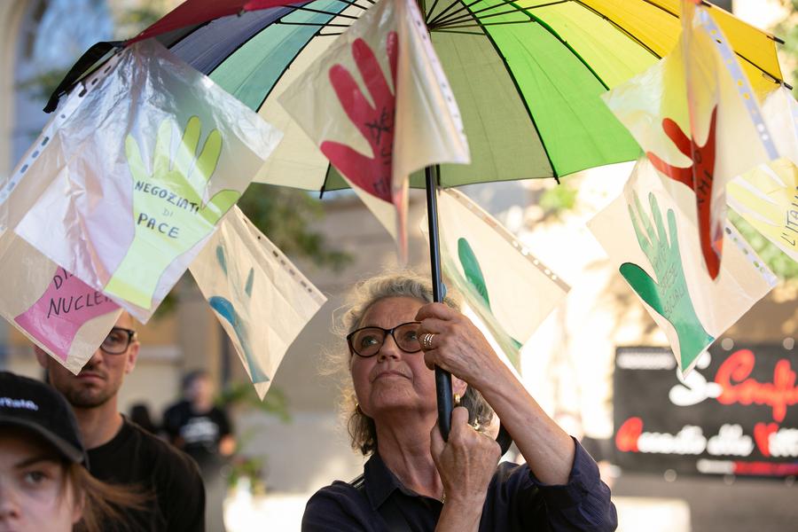 A woman protests during an anti-G7 manifestation at Fasano, Apulia in southern Italy, June 14, 2024. (Xinhua/Li Jing)
