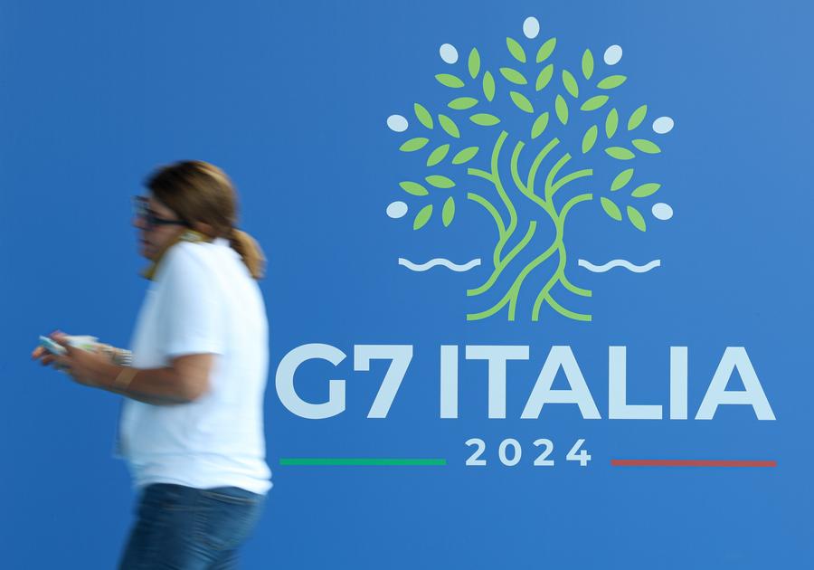 A woman walks past the banner of the Group of Seven (G7) summit at the media center in Bari, Apulia Region, Italy, June 12, 2024. (Xinhua/Li Jing)