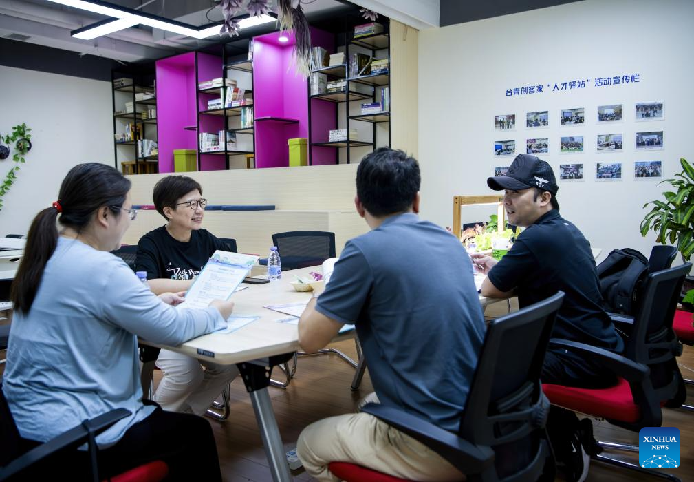 A Taiwanese student from Huaqiao University (2nd R) carries out internship at T-makers in Xiamen, southeast China's Fujian Province, June 14, 2024. (Xinhua/Wei Peiquan)