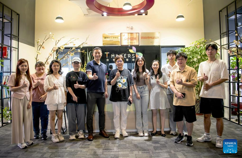 Yu Hui-fang (C), head of T-makers, poses for a group photo with part of her team members at T-makers in Xiamen, southeast China's Fujian Province, June 14, 2024. Based in Xiamen of southeast China's Fujian Province, T-makers is a platform dedicated to providing services of innovation and entrepreneurship for young people from both sides of the Taiwan Strait.