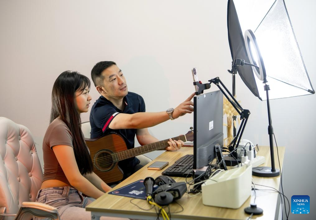Lee Chia-hsun (L), a young Taiwanese who graduated from Jimei University, learns about e-commerce and livestreaming at T-makers in Xiamen, southeast China's Fujian Province, June 14, 2024. (Xinhua/Wei Peiquan)