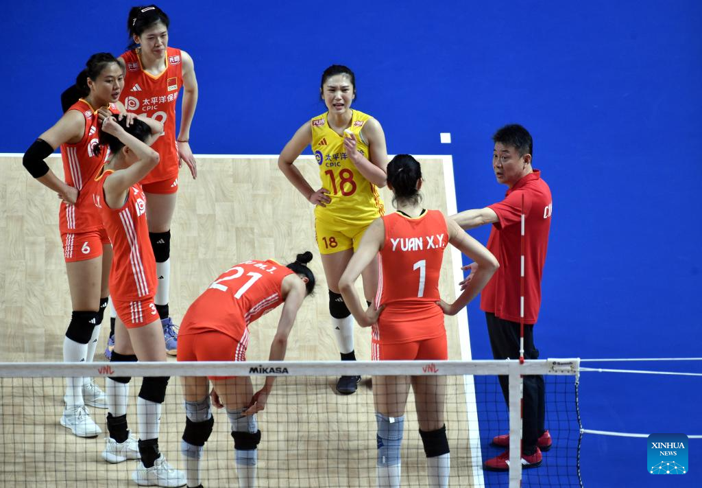 Cai Bin (1st R) , head coach of China instructs players during the preliminary match between China and Trkiye at the Women's Volleyball Nations League 2024 Hong Kong in Hong Kong, south China, June 15, 2024. (Xinhua/Lo Ping Fai)