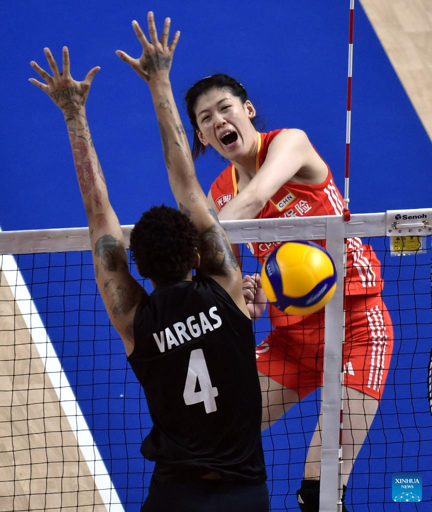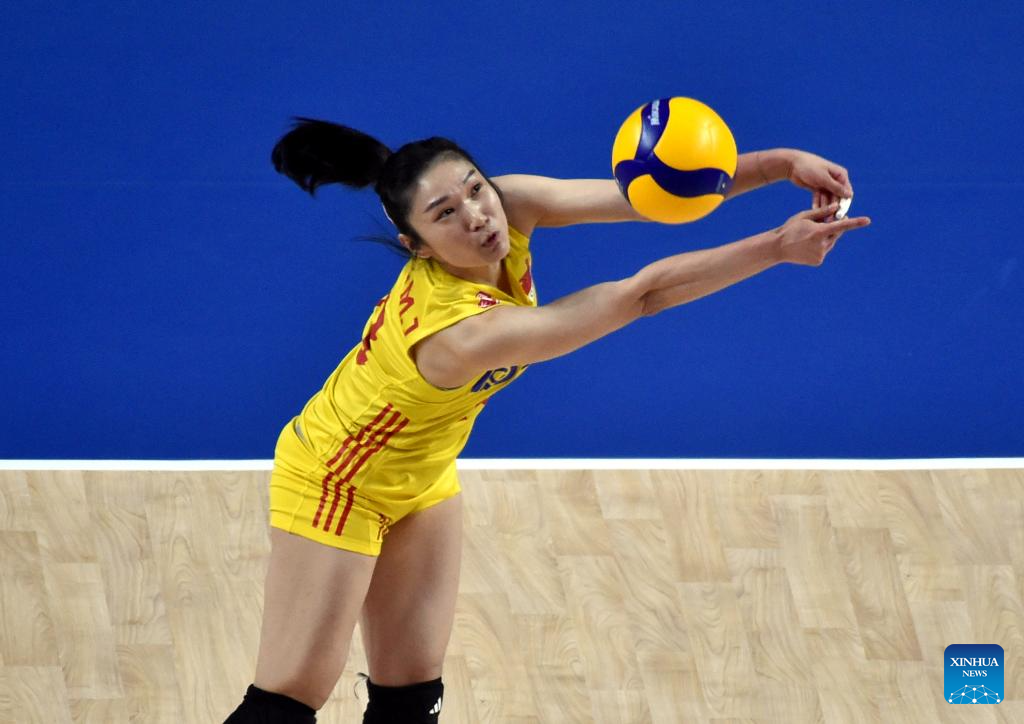 Gong Xiangyu (1st L) of China competes during the preliminary match between China and Trkiye at the Women's Volleyball Nations League 2024 Hong Kong in Hong Kong, south China, June 15, 2024. (Xinhua/Lo Ping Fai)