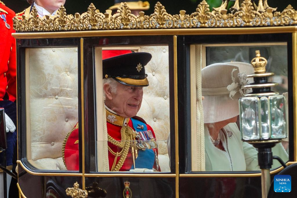 Britain's King Charles III and Queen Camilla ride a royal carriage during the Trooping the Colour parade to honour him on his official birthday in London, Britain, on June 15, 2024. (Photo by Stephen Chung/Xinhua)