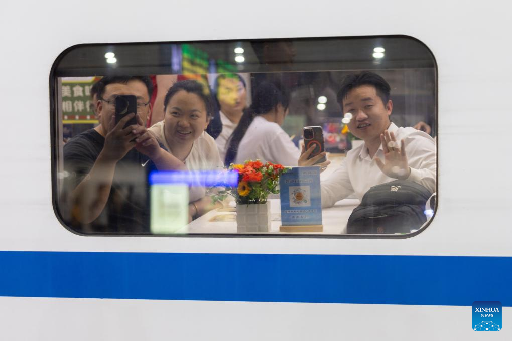 Passengers order food onboard the high-speed sleeper train D910 bound for Beijing West Railway Station, in Hong Kong, south China, June 15, 2024. High-speed sleeper trains linking Beijing and Shanghai with Hong Kong commenced operations on Saturday.