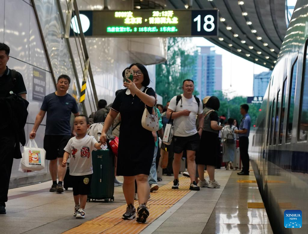 Passengers prepare to board the high-speed sleeper train D909 bound for Hong Kong's West Kowloon Station at Beijing West Railway Station in Beijing, capital of China, June 15, 2024. High-speed sleeper trains linking Beijing and Shanghai with Hong Kong commenced operations on Saturday.