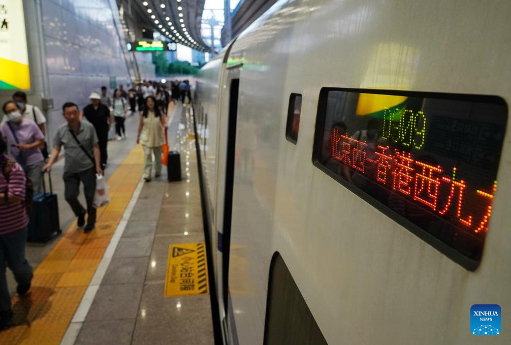 Passengers board the high-speed sleeper train D909 bound for Hong Kong's West Kowloon Station at Beijing West Railway Station in Beijing, capital of China, June 15, 2024. High-speed sleeper trains linking Beijing and Shanghai with Hong Kong commenced operations on Saturday.