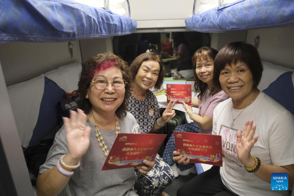 Passengers boarding the high-speed sleeper train D907 bound for Hong Kong's West Kowloon Station wave good-bye at Shanghai Hongqiao Railway Station in east China's Shanghai, June 15, 2024. High-speed sleeper trains linking Beijing and Shanghai with Hong Kong commenced operations on Saturday.