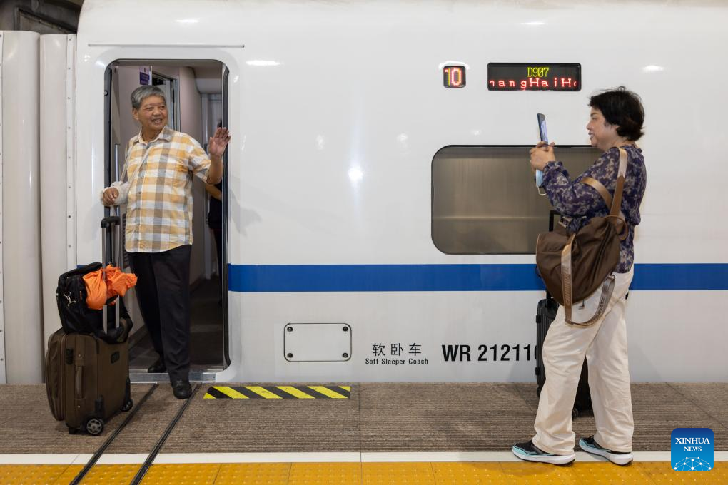 A passenger poses for photos before boarding the high-speed sleeper train D907 bound for Hong Kong's West Kowloon Station at Shanghai Hongqiao Railway Station in east China's Shanghai, June 15, 2024. High-speed sleeper trains linking Beijing and Shanghai with Hong Kong commenced operations on Saturday.