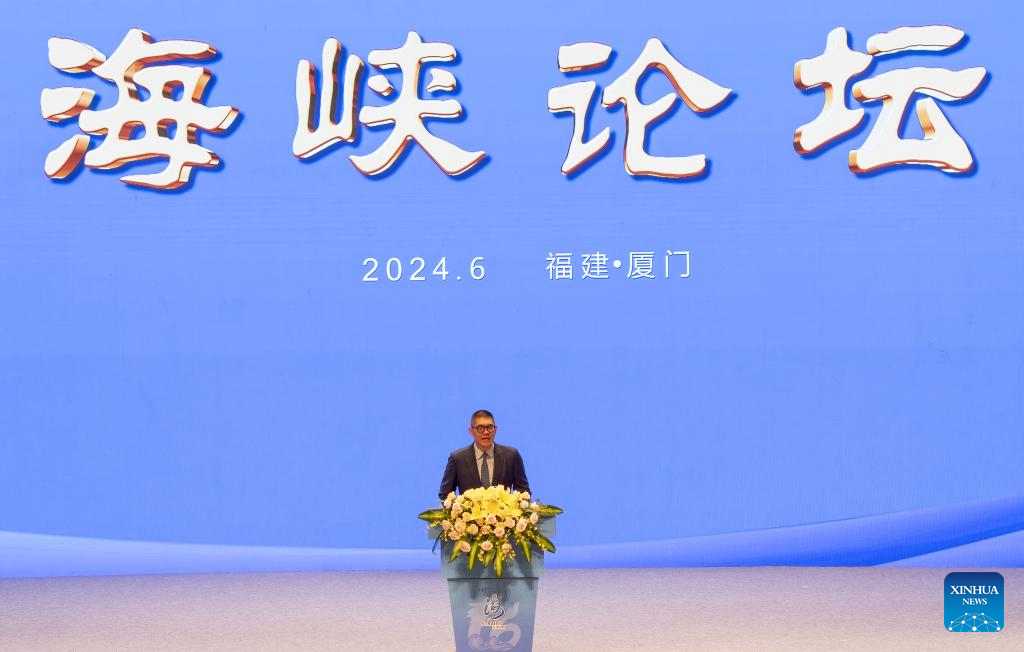 Sean Lien, vice chair of the Chinese Kuomintang (KMT) party, speaks during the main meeting of the 16th Straits Forum in Xiamen, southeast China's Fujian Province, June 15, 2024. The main meeting of the 16th Straits Forum was held here on Saturday. (Xinhua/Wei Peiquan)