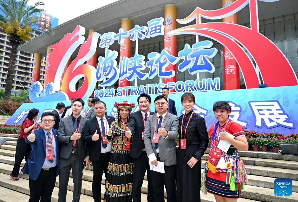Guests attending the main meeting of the 16th Straits Forum pose for photos outside the venue in Xiamen, southeast China's Fujian Province, June 15, 2024. The main meeting of the 16th Straits Forum was held here on Saturday. (Xinhua/Lin Shanchuan)