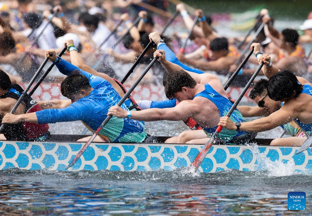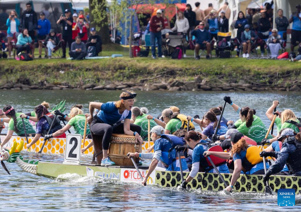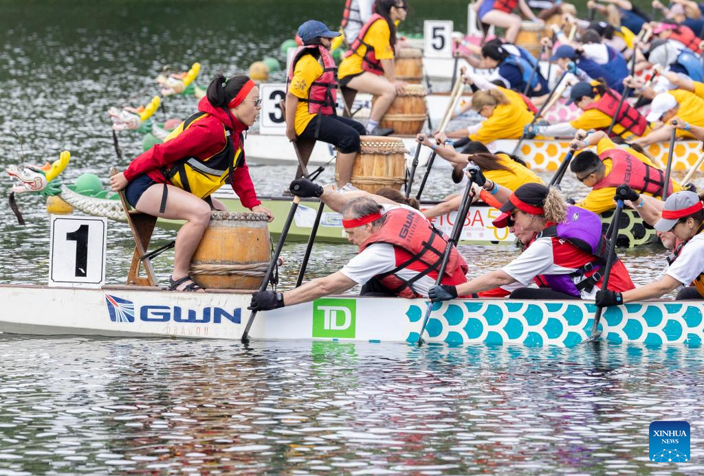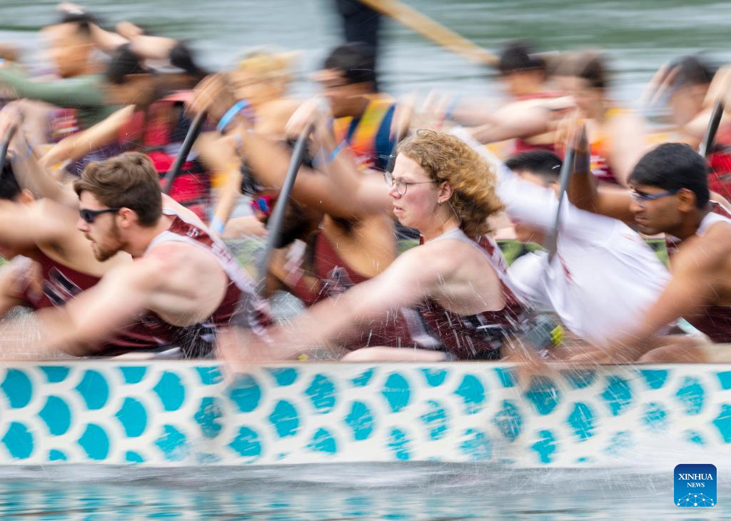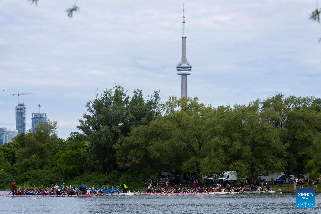 Participants compete during the 2024 Toronto International Dragon Boat Race Festival in Toronto, Canada, on June 16, 2024. (Photo by Zou Zheng/Xinhua)