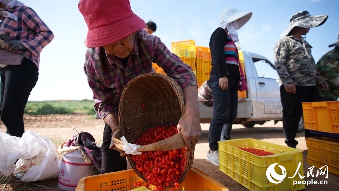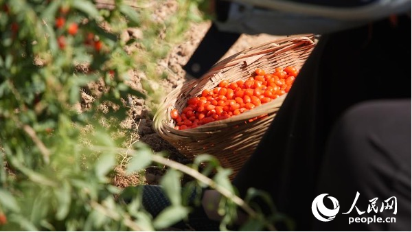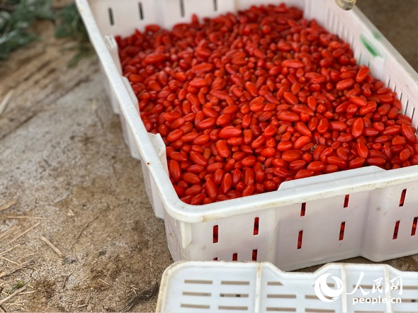 Photo shows goji berries picked at a planting base in Zhongwei, Ningxia Hui Autonomous Region. (Photo/People's Daily Online)