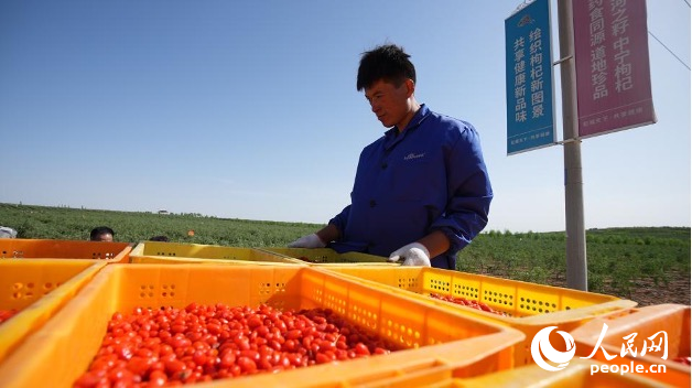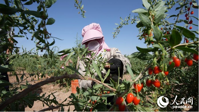 A worker picks goji berries at a planting base in Zhongwei, Ningxia Hui Autonomous Region. (Photo/People's Daily Online)