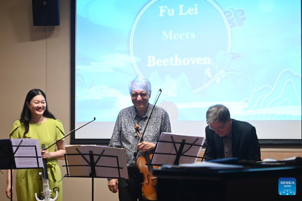 Musicians perform at the "Harmony in Translation: Fu Lei Meets Beethoven" concert in Valletta, Malta, June 16, 2024. Beethoven's masterpieces came together with texts by a renowned Chinese translator on Sunday night for a concert in Malta called: "Harmony in Translation: Fu Lei Meets Beethoven. "The performance by a trio featuring Niu Ruixin and Pierre-Henri Xuereb on the viola, and Pascal Mantin on the piano was held at the China Cultural Center in Malta. Fu Lei is famous for his contributions to Chinese literature as a translator of French classics, including works by Rolland, Balzac, Voltaire, and Hippolyte Taine. One of Fu's first translations was Rolland's "Beethoven." (Photo by Jonathan Borg/Xinhua)
