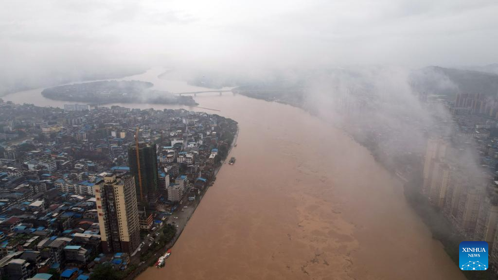 Torrential rainfall elevates water level in section of Rongjiang River in S China