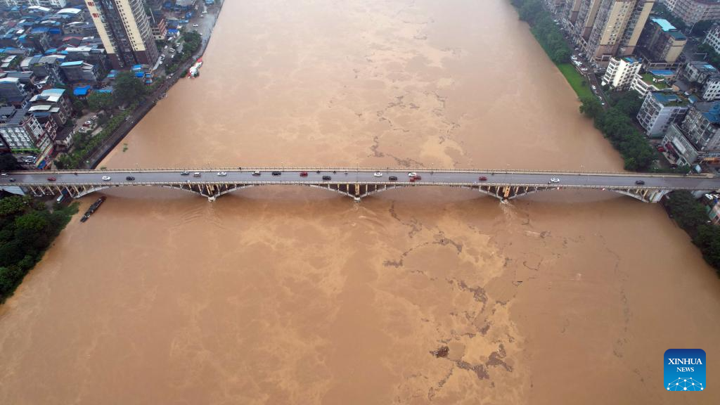 As of 11 a.m. Tuesday, torrential rainfall has elevated the water level in this section of Rongjiang River to 114.79 meters, or 0.19 meters above the alert line. (Xinhua/Huang Xiaobang)