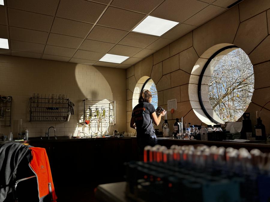 A staff of Rymill Coonawarra testes wine in a laboratory in Coonawarra, South Australia, on May 28, 2024. (Photo by Li Ting/Xinhua)