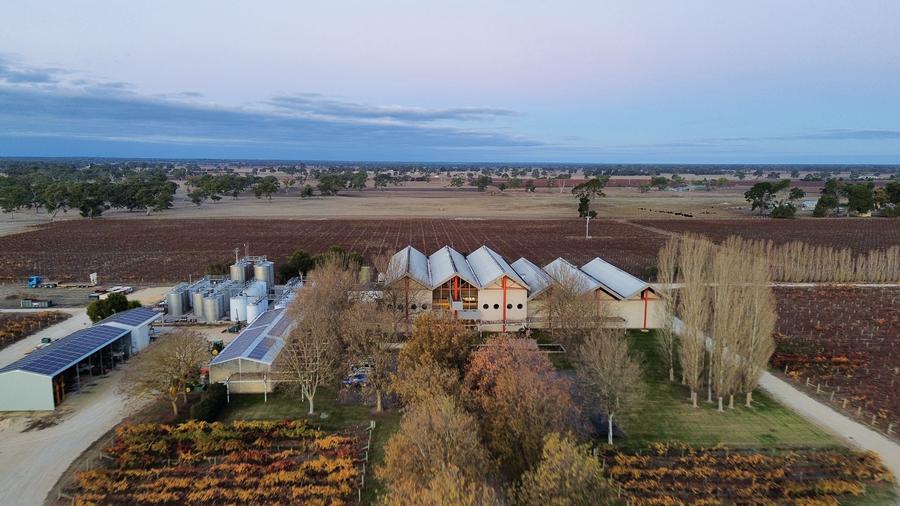An aerial drone photo taken on May 22, 2024 shows a view of the winery Rymill Coonawarra in Coonawarra, South Australia. (Photo by Li Ting/Xinhua)