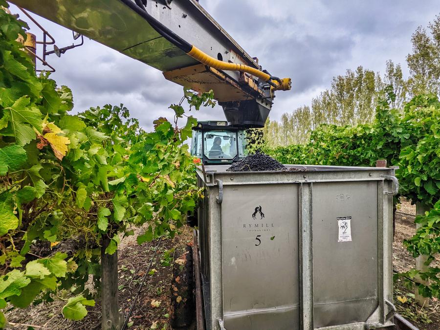 A staff harvests grapes at Rymill Coonawarra's vineyard in South Australia, on March 16, 2022. (Xinhua)