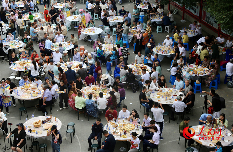 Residents of different ethnic groups share homemade food at an annual grand feast named "hundred family feast" in the Guyuanxiang community in Tianshan district, Urumqi, capital of northwest China's Xinjiang Uygur Autonomous Region, to celebrate the Corban Festival, one of the major festivals of Muslims in China, on June 17, 2024. (People's Daily Online/Li Long)