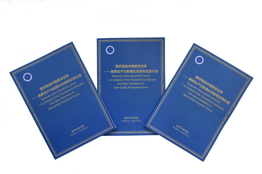 This photo shows the report "Empower China, Benefit the World -- an Analysis of the Theoretical Contribution and Value Orientation of New Quality Productive Forces" (Chinese and English editions). The report on new quality productive forces was launched in Brussels, Belgium on Wednesday by Xinhua Institute, a high-end think tank of Xinhua News Agency. (Xinhua/Jin Liangkuai)