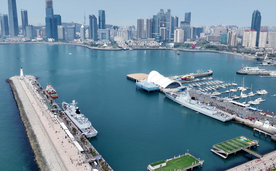 This aerial drone photo shows people visiting navy vessels at the Qingdao International Sailing Center pier in Qingdao, east China's Shandong Province, April 22, 2024. (Photo by Ma Jiewen/Xinhua)