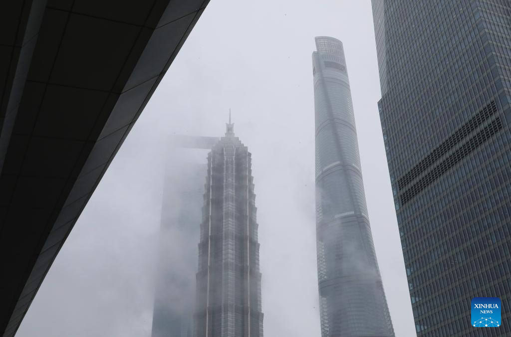 Skyscrapers are surrounded by clouds in Lujiazui, a finance zone in Shanghai, east China, June 19, 2024. Meteorological authorities in Shanghai issued a yellow alert for lightning and a blue alert for rainstorms on Tuesday. (Xinhua/Fang Zhe)