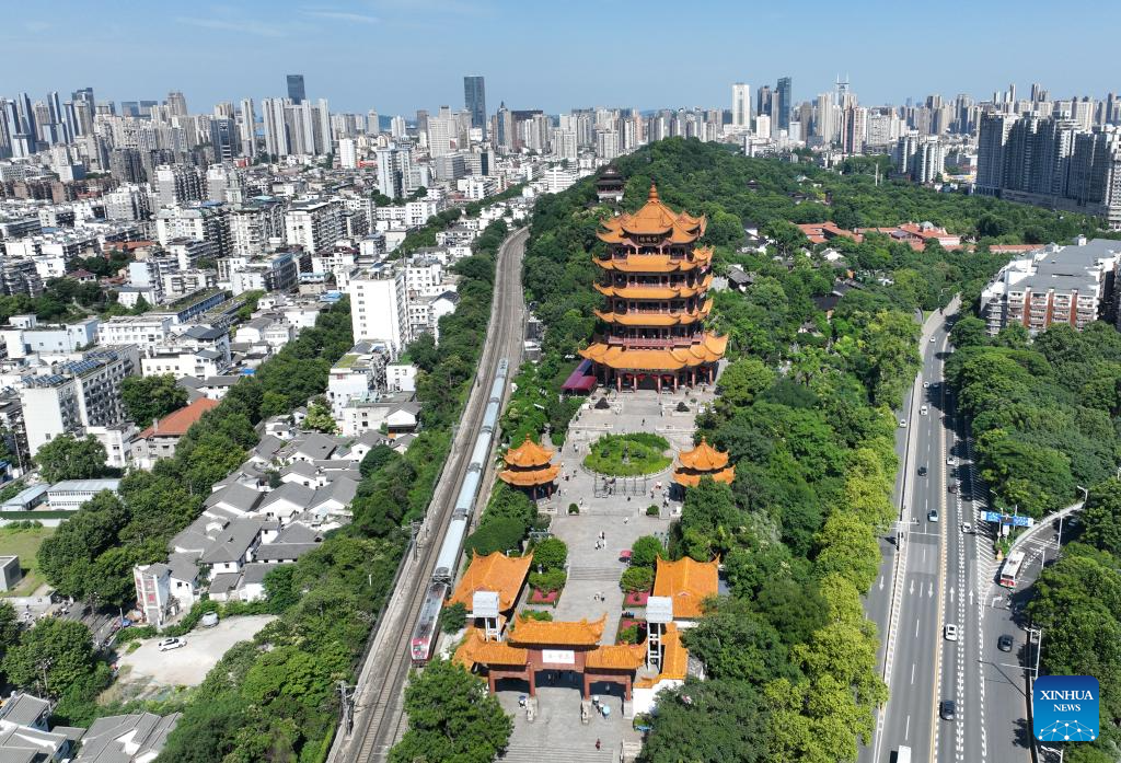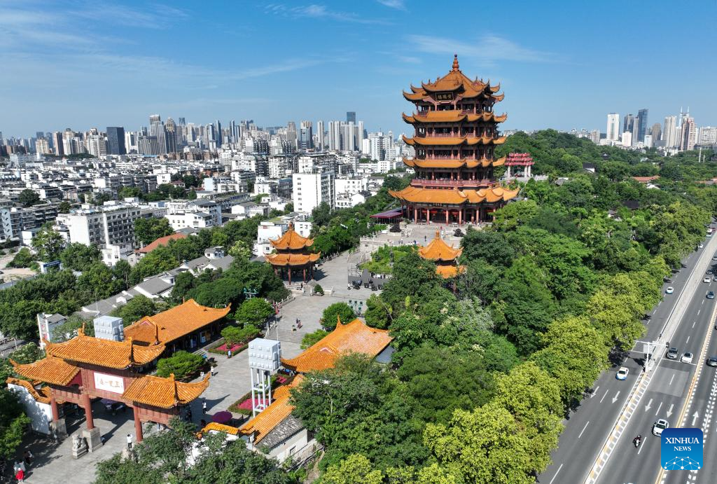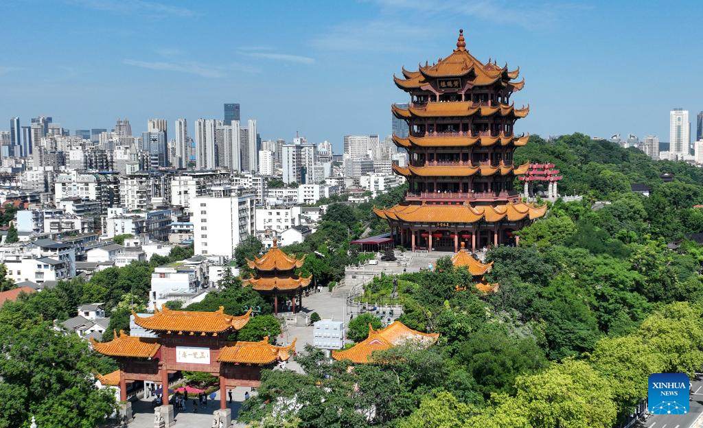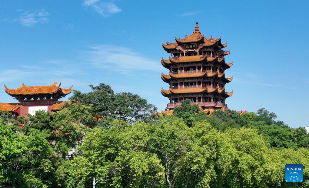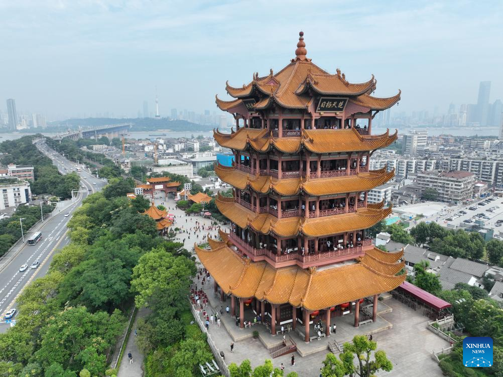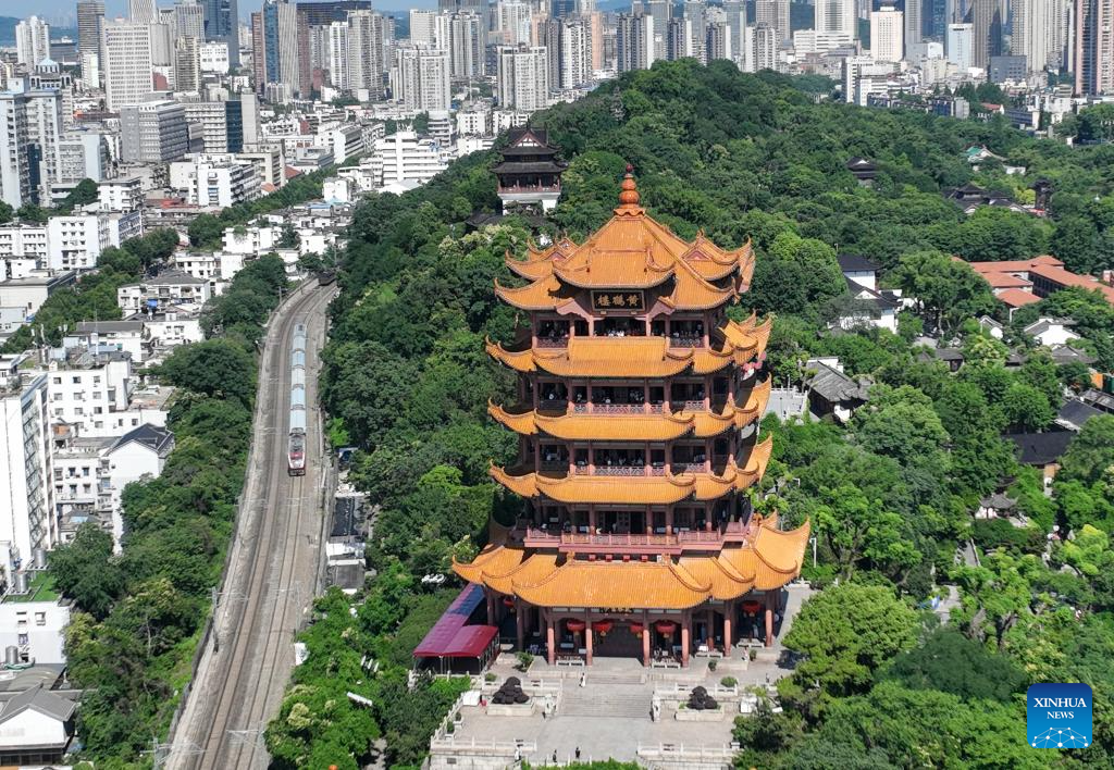 An aerial drone photo taken on June 1, 2024 shows a view of the Yellow Crane Tower in Wuhan City of China's Hubei Province. The Stork Tower in Shanxi Province, the Tengwang Pavilion in Jiangxi Province, the Yueyang Tower in Hunan Province and the Yellow Crane Tower in Hubei Province, four famous landmarks in China's central region, attract tourists with exquisite architectural art, magnificent scenery and profound history and culture. (Xinhua/Cheng Min)