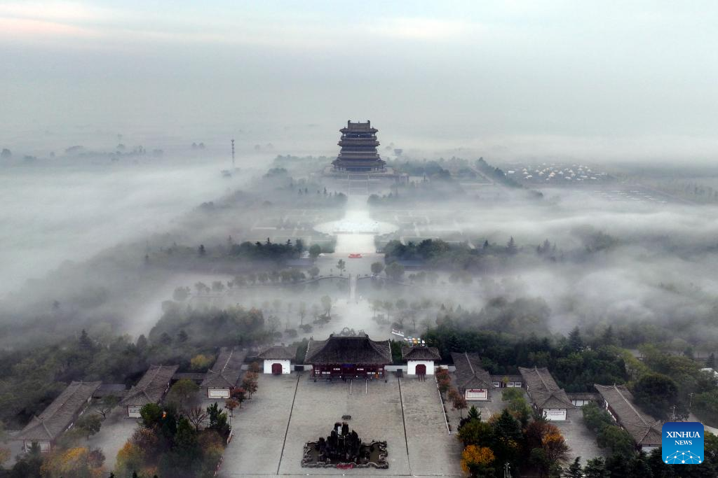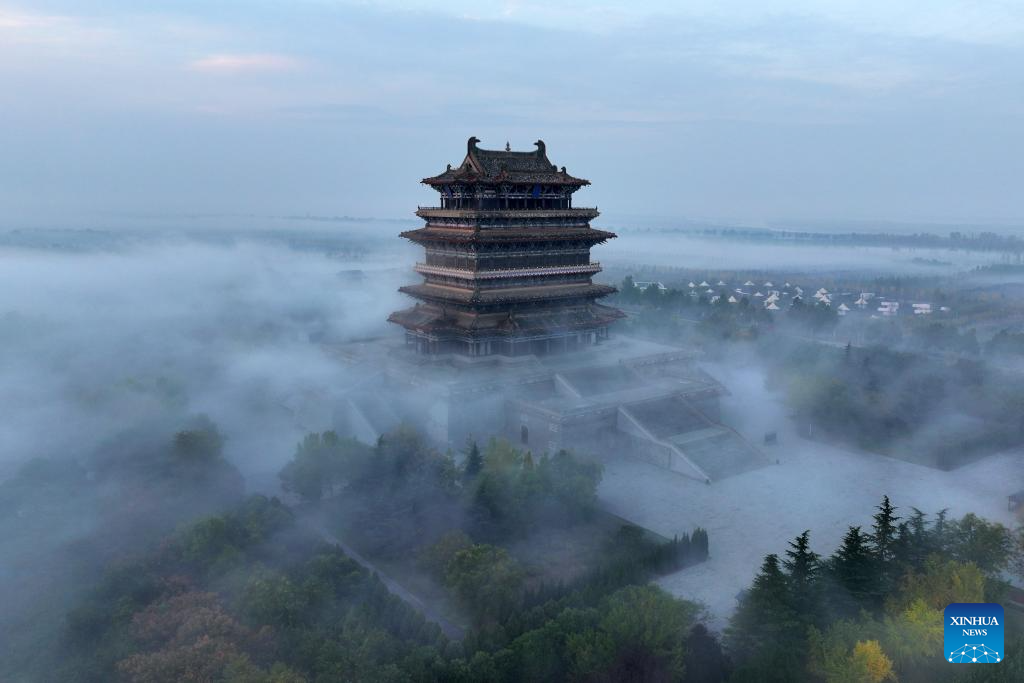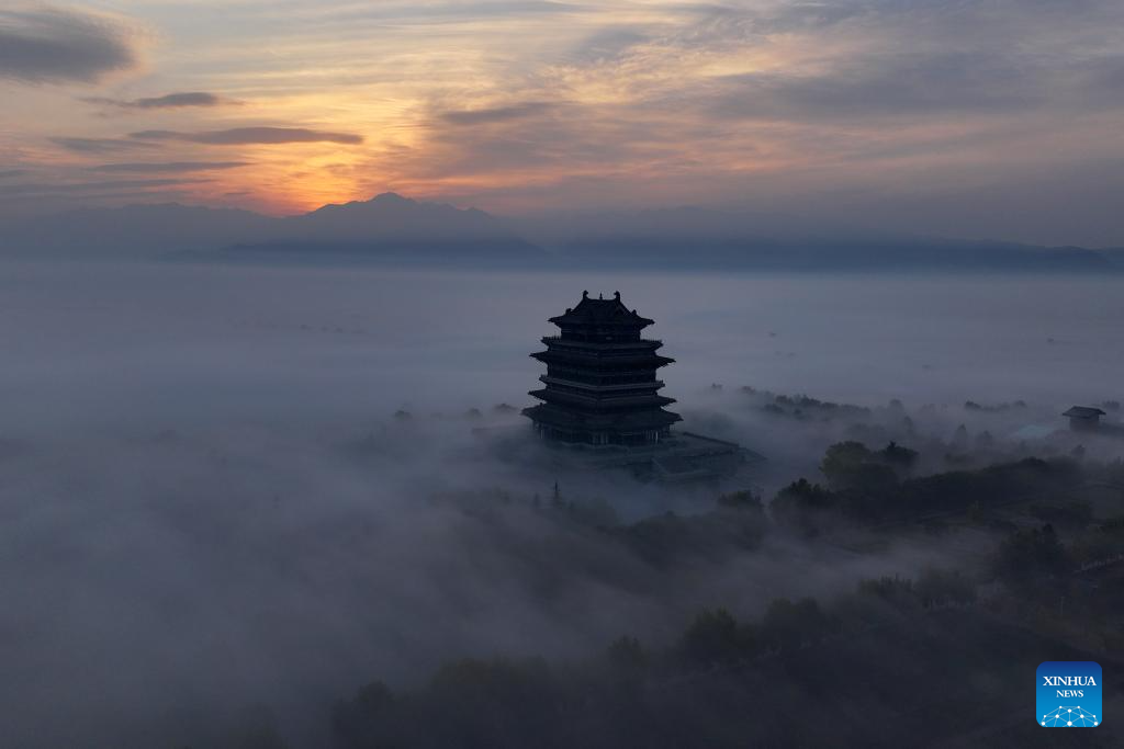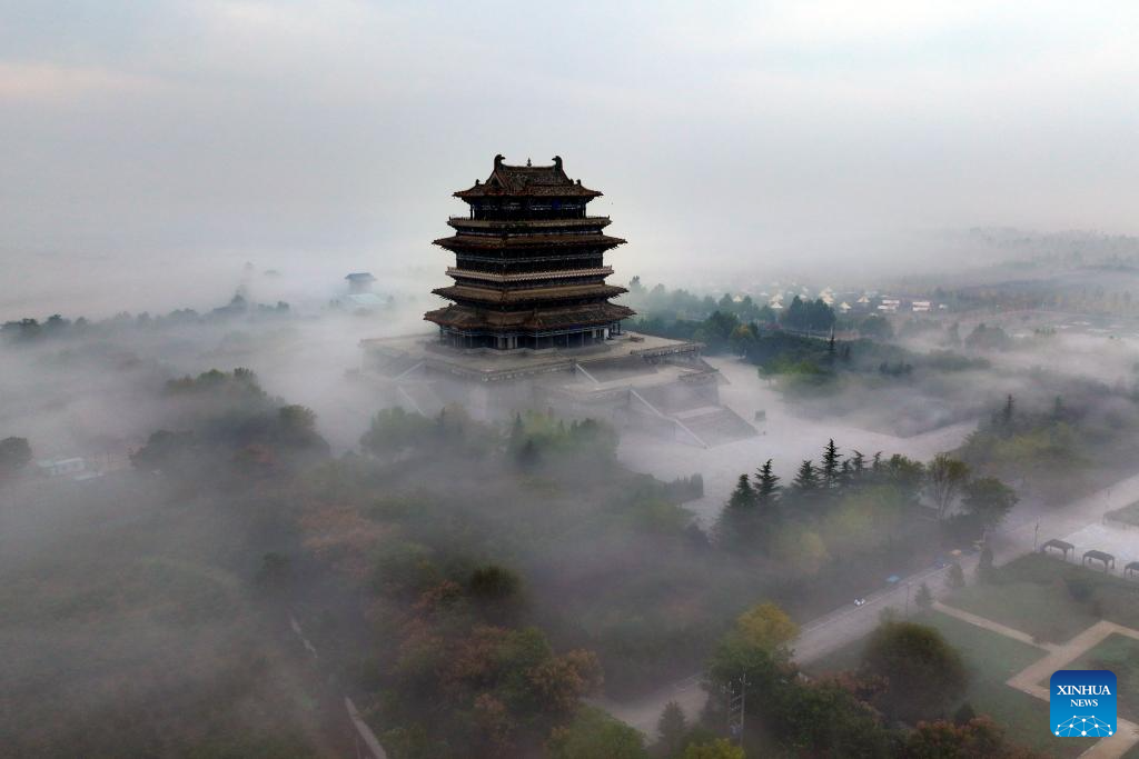 An aerial drone photo taken on Oct. 26, 2023 shows a view of the Stork Tower, also known as Guanquelou in Chinese, in Yongji City of China's Shanxi Province. The Stork Tower in Shanxi Province, the Tengwang Pavilion in Jiangxi Province, the Yueyang Tower in Hunan Province and the Yellow Crane Tower in Hubei Province, four famous landmarks in China's central region, attract tourists with exquisite architectural art, magnificent scenery and profound history and culture. (Photo by Chen Chunming/Xinhua)