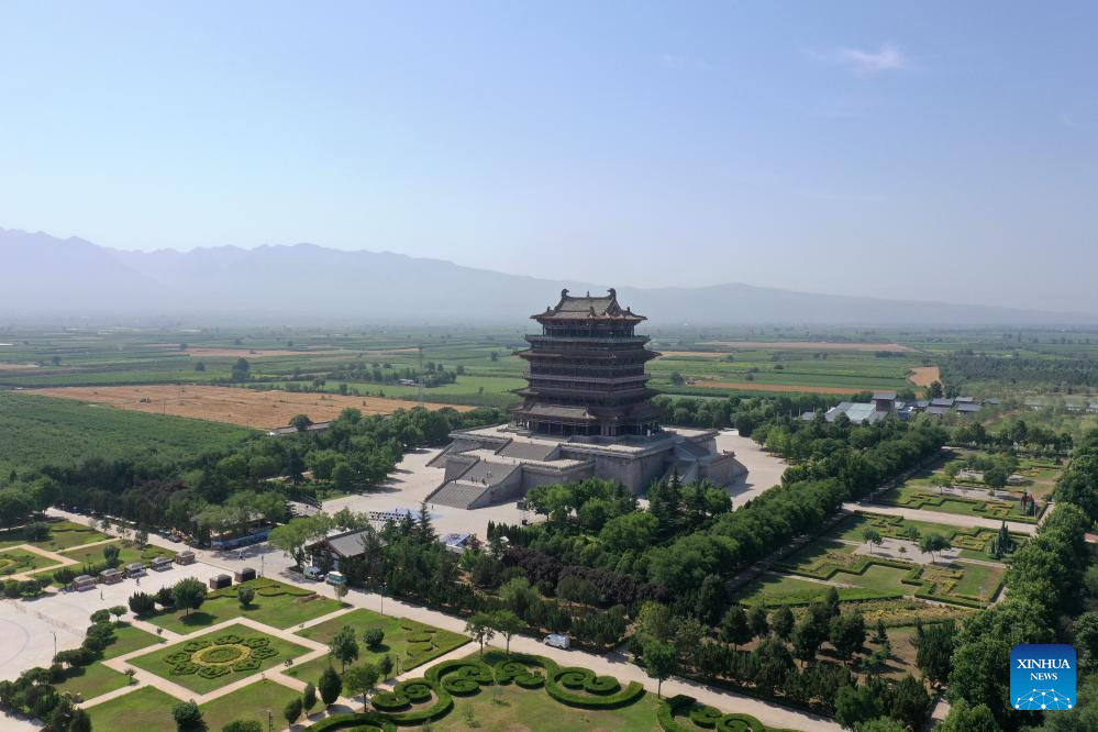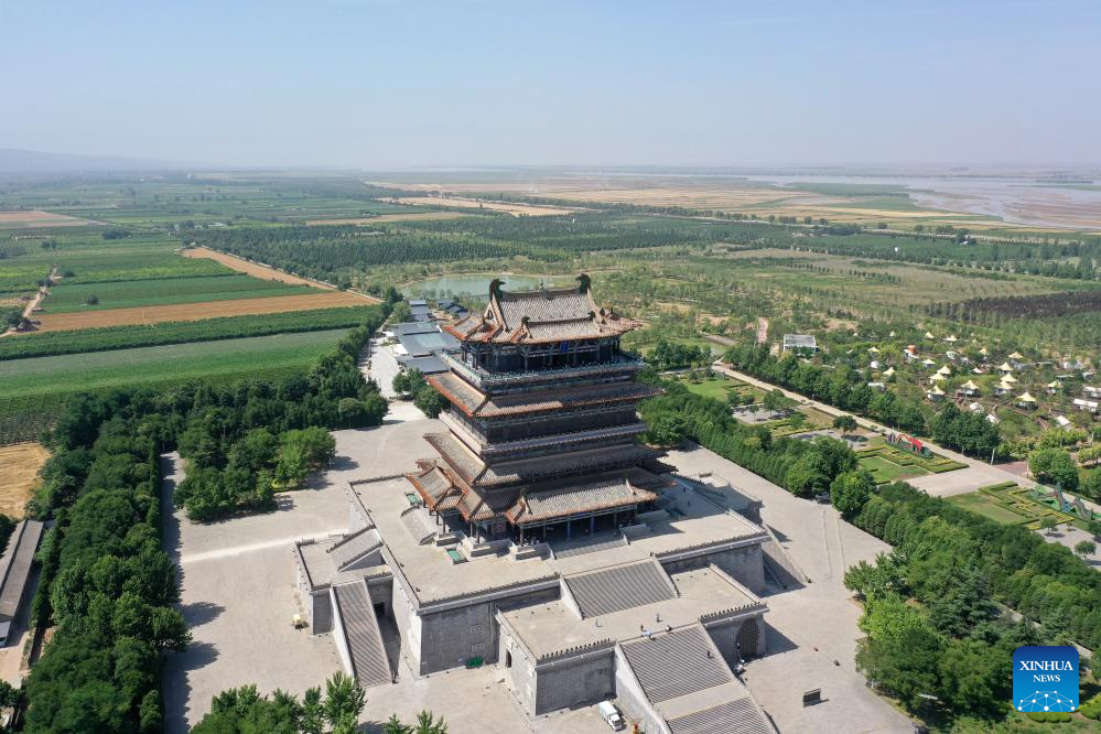 An aerial drone photo taken on June 12, 2024 shows a view of the Stork Tower, also known as Guanquelou in Chinese, in Yongji City of China's Shanxi Province. The Stork Tower in Shanxi Province, the Tengwang Pavilion in Jiangxi Province, the Yueyang Tower in Hunan Province and the Yellow Crane Tower in Hubei Province, four famous landmarks in China's central region, attract tourists with exquisite architectural art, magnificent scenery and profound history and culture. (Xinhua/Zhan Yan)