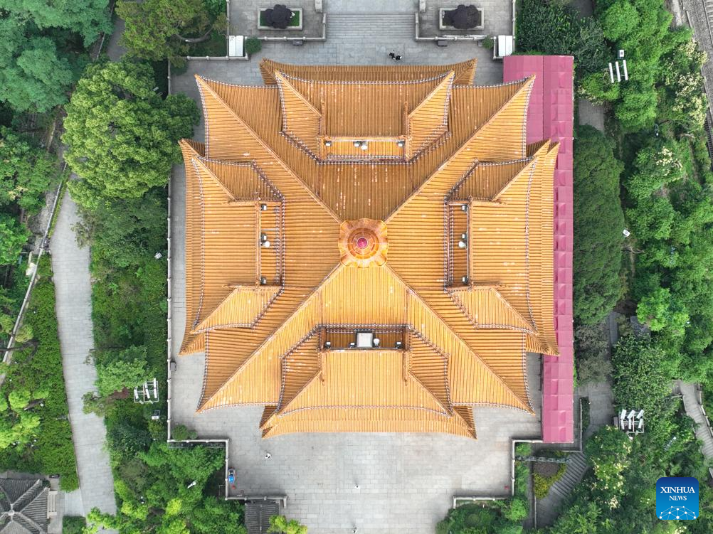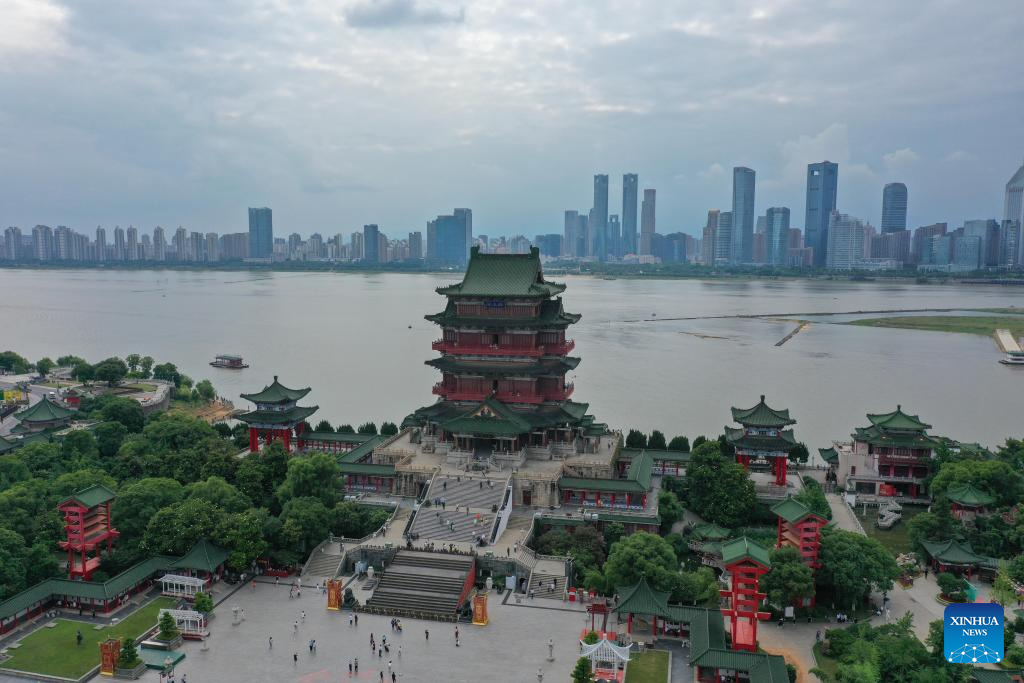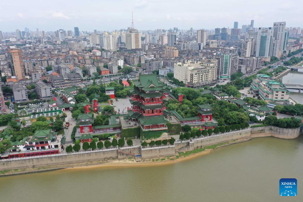 An aerial drone photo taken on June 6, 2024 shows a view of the Tengwang Pavilion in Nanchang City of China's Jiangxi Province. The Stork Tower in Shanxi Province, the Tengwang Pavilion in Jiangxi Province, the Yueyang Tower in Hunan Province and the Yellow Crane Tower in Hubei Province, four famous landmarks in China's central region, attract tourists with exquisite architectural art, magnificent scenery and profound history and culture. (Xinhua/Zhou Mi)
