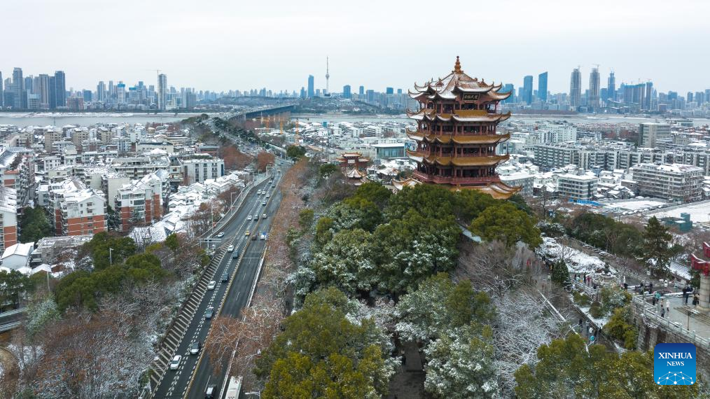 An aerial drone photo taken on Jan. 15, 2023 shows a view of the Yellow Crane Tower in Wuhan City of China's Hubei Province. The Stork Tower in Shanxi Province, the Tengwang Pavilion in Jiangxi Province, the Yueyang Tower in Hunan Province and the Yellow Crane Tower in Hubei Province, four famous landmarks in China's central region, attract tourists with exquisite architectural art, magnificent scenery and profound history and culture. (Xinhua/Xiao Yijiu)