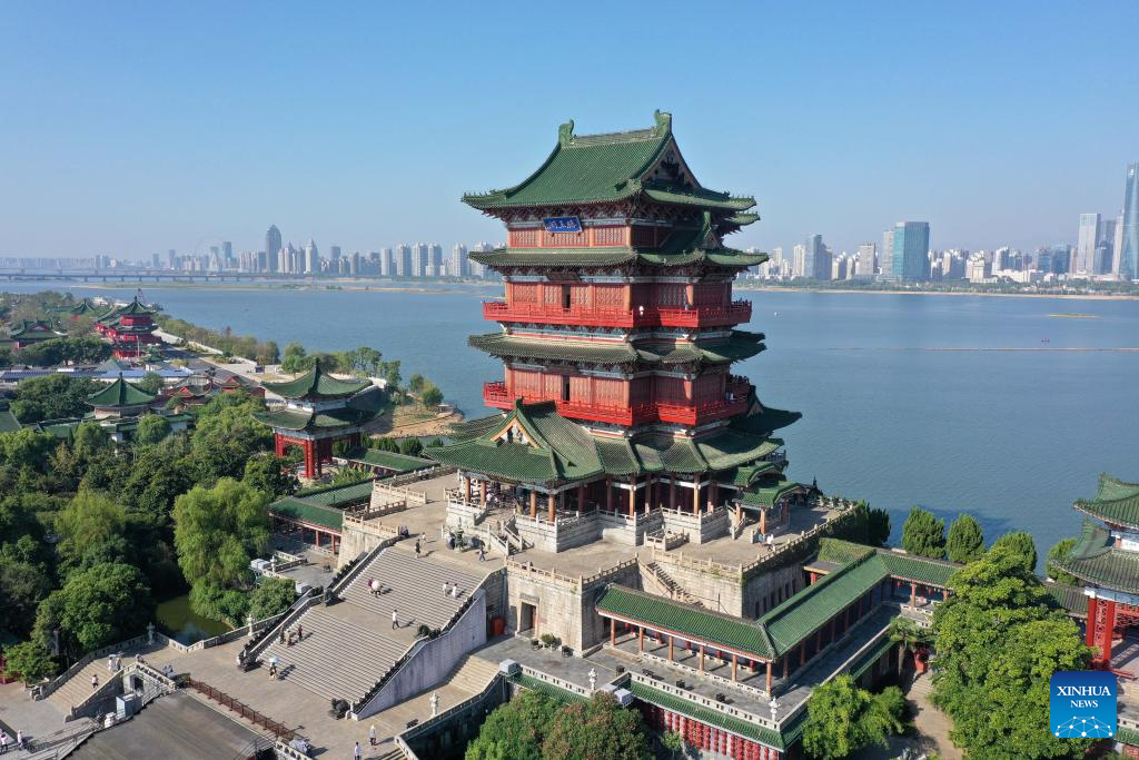 An aerial drone photo taken on Oct. 5, 2021 shows a view of the Tengwang Pavilion in Nanchang City of China's Jiangxi Province. The Stork Tower in Shanxi Province, the Tengwang Pavilion in Jiangxi Province, the Yueyang Tower in Hunan Province and the Yellow Crane Tower in Hubei Province, four famous landmarks in China's central region, attract tourists with exquisite architectural art, magnificent scenery and profound history and culture. (Xinhua/Peng Zhaozhi)