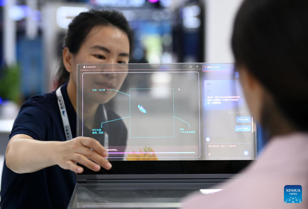 A staff member introduces a Lenovo laptop with a transparent display at the World Intelligence Expo 2024 in north China's Tianjin, June 20, 2024.