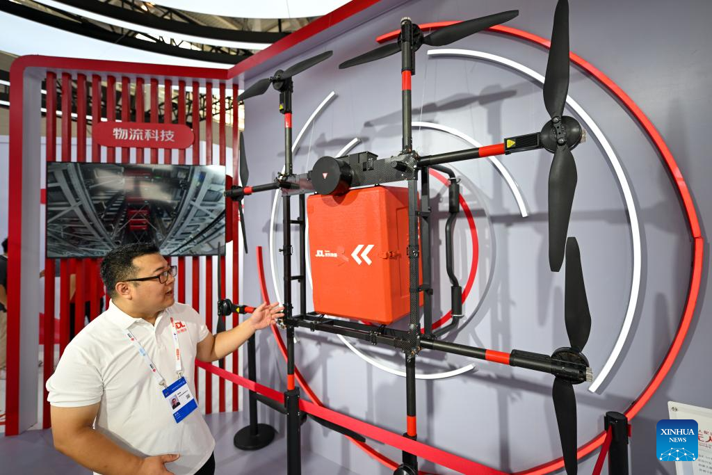 An exhibitor introduces a delivery UAV (unmanned aerial vehicle) at the World Intelligence Expo 2024 in north China's Tianjin, June 20, 2024.