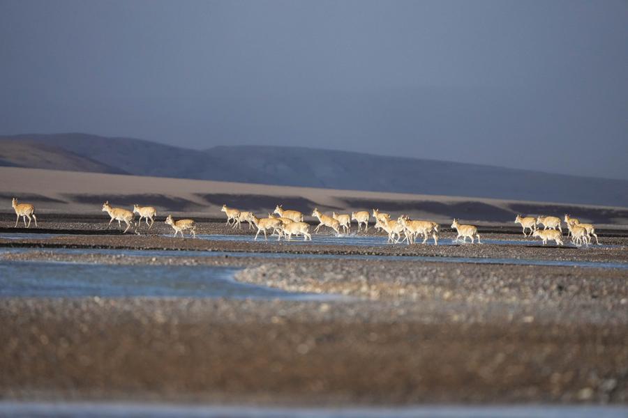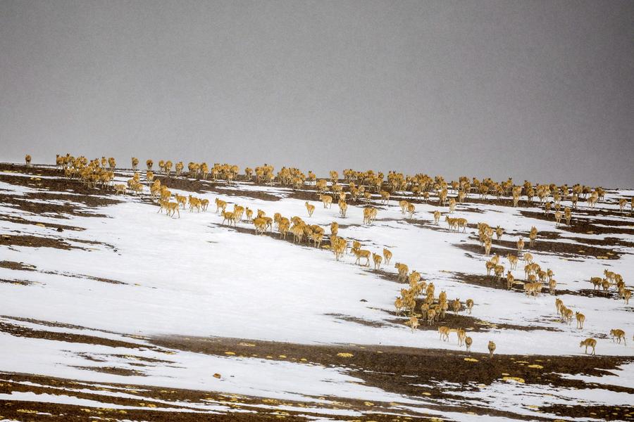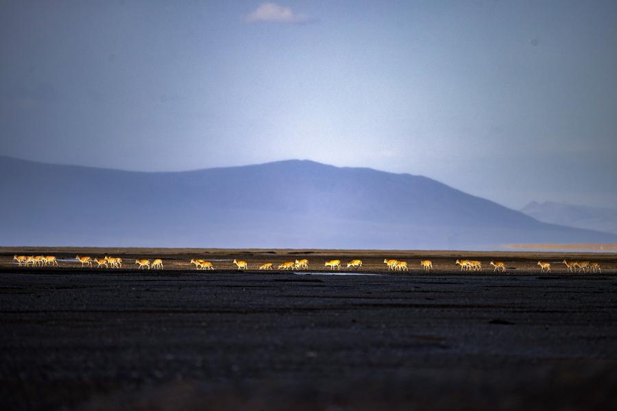 Tibetan antelopes are on migration in Qiangtang National Nature Reserve in southwest China's Xizang Autonomous Region, May 8, 2024. (Xinhua/Tenzin Nyida)