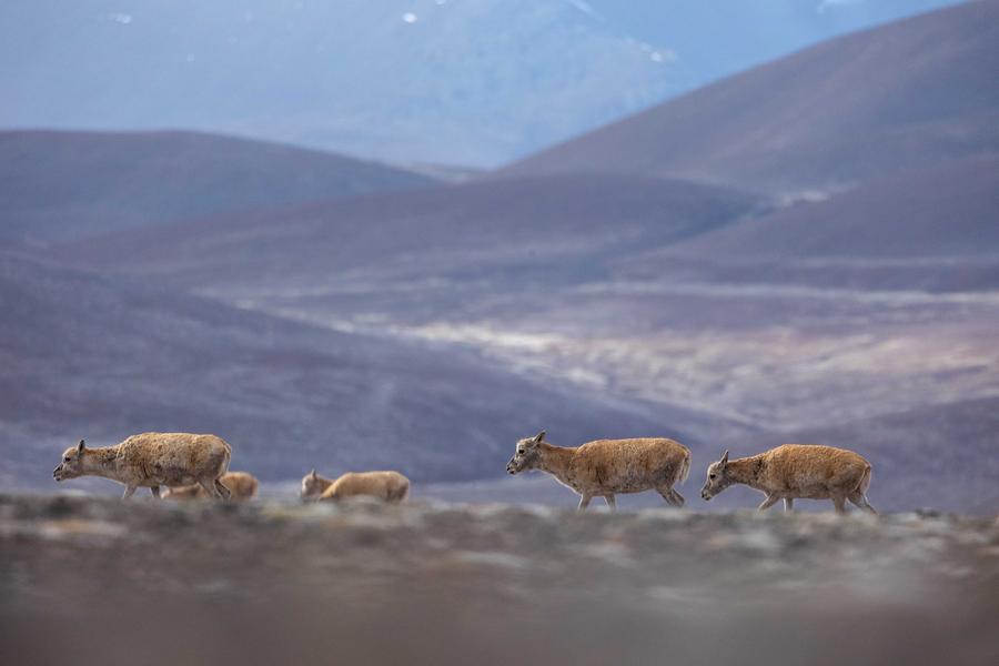 Tibetan antelopes climb over the ridge during their migration in Qiangtang National Nature Reserve in southwest China's Xizang Autonomous Region, May 10, 2024. (Xinhua/Jiang Fan)
