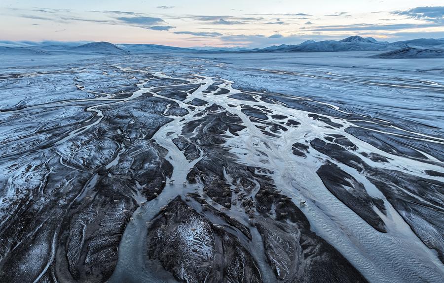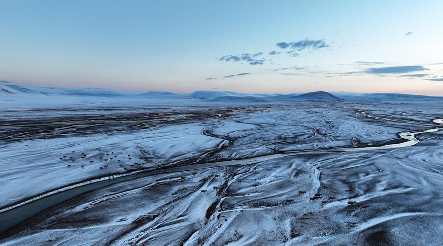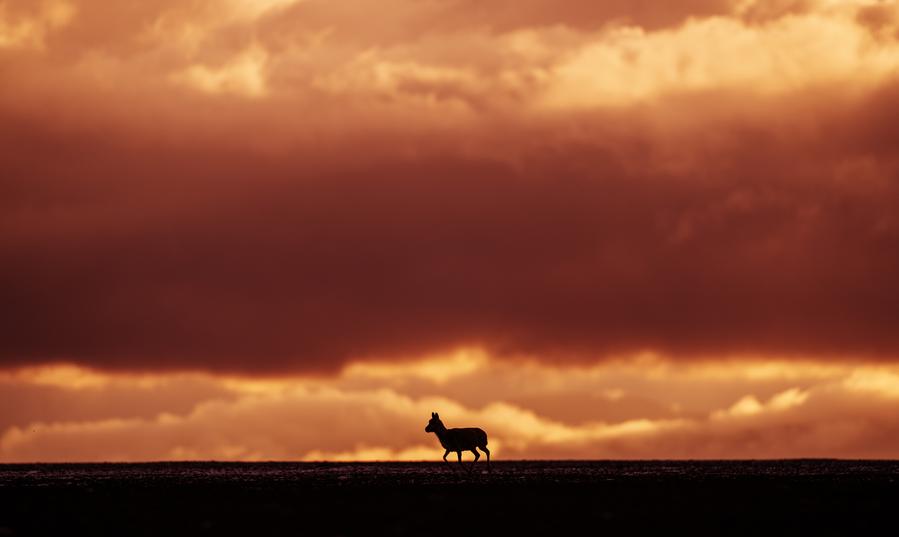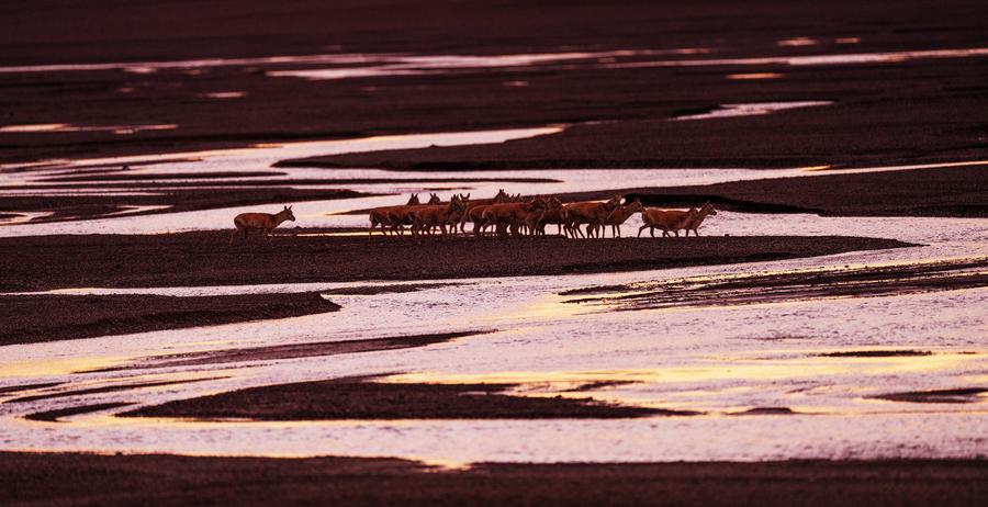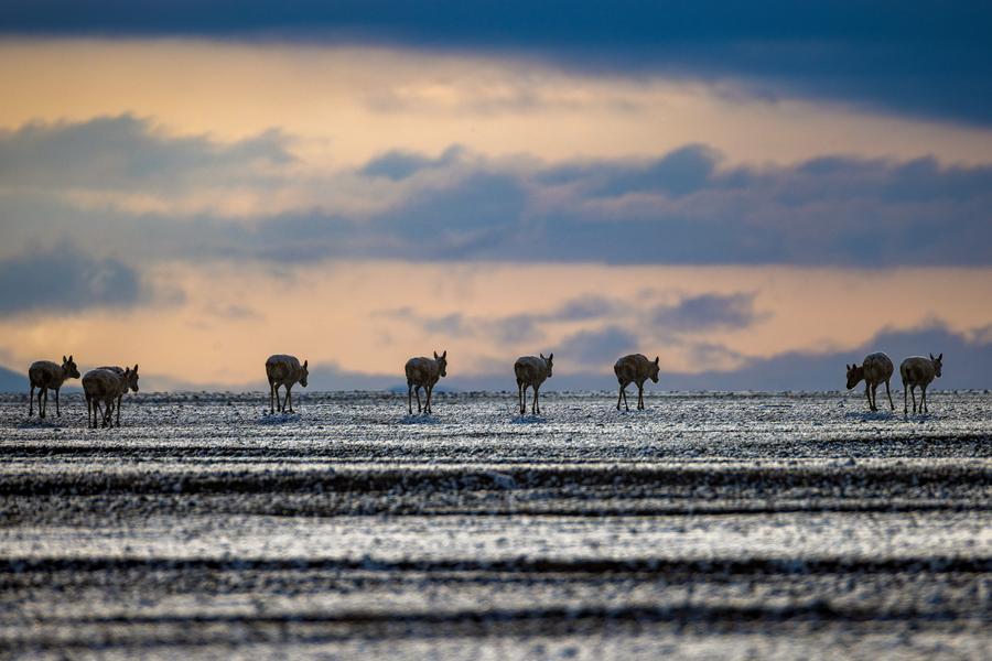 Tibetan antelopes are on migration in twilight in Qiangtang National Nature Reserve in southwest China's Xizang Autonomous Region, June 13, 2024. (Xinhua/Jiang Fan)