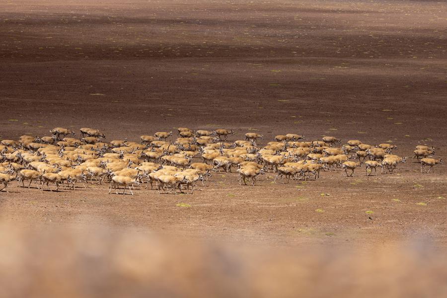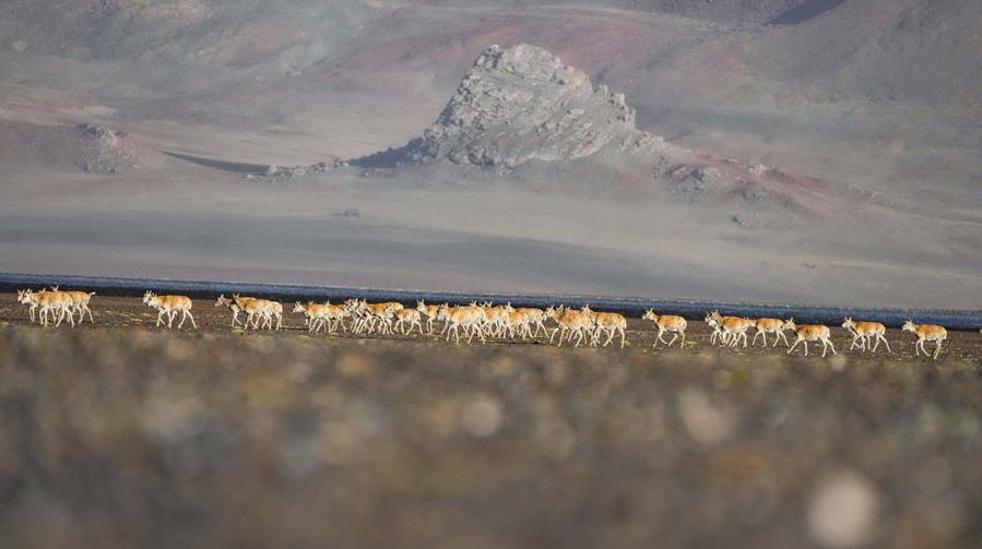 Tibetan antelopes are on migration in Qiangtang National Nature Reserve in southwest China's Xizang Autonomous Region, June 14, 2024. (Xinhua/Tenzing Nima Qadhup)