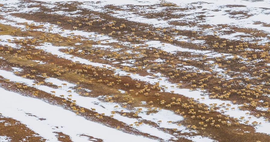An aerial drone photo taken on May 9, 2024 shows Tibetan antelopes on migration to their birth-giving ground in Qiangtang National Nature Reserve in southwest China's Xizang Autonomous Region. (Xinhua/Tenzin Nyida)
