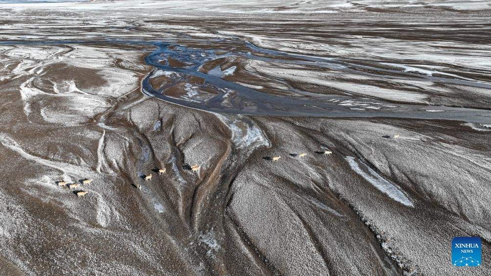 An aerial drone photo taken on June 15, 2024 shows Tibetan antelopes going across the Tianshui River in the Qiangtang National Nature Reserve in southwest China's Xizang Autonomous Region. Tianshui River is an important migratory passage for pregnant Tibetan antelopes in the Qiangtang National Nature Reserve. (Xinhua/Jigme Dorje)