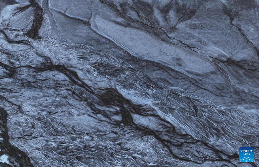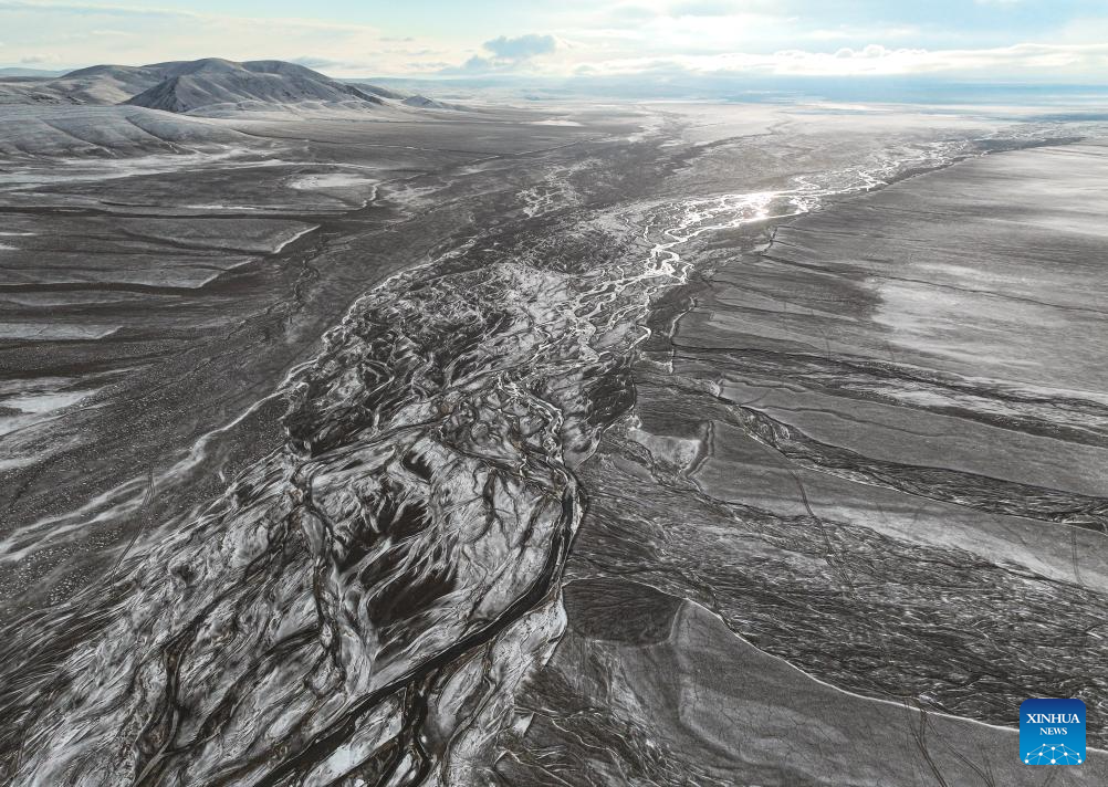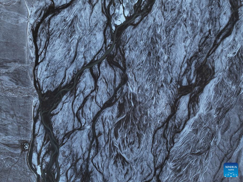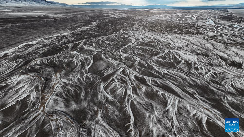 An aerial drone photo taken on June 15, 2024 shows trails left by Tibetan antelopes on the riverbed of the Tianshui River in the Qiangtang National Nature Reserve in southwest China's Xizang Autonomous Region. Tianshui River is an important migratory passage for pregnant Tibetan antelopes in the Qiangtang National Nature Reserve. (Xinhua/Jigme Dorje)